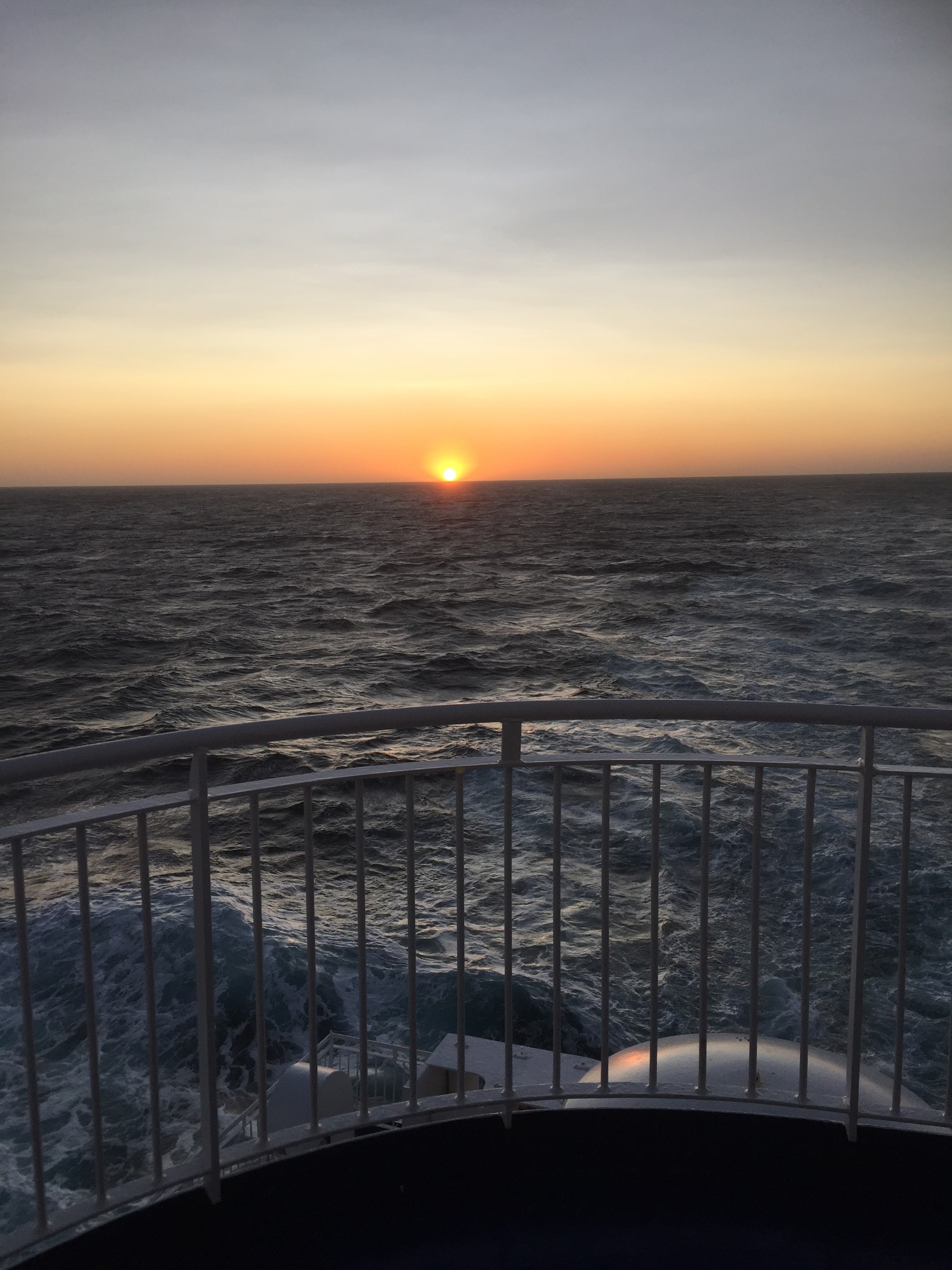 Wir haben super an Bord geschlafen und beginnen den Tag mit Sonnenaufgang auf dem Achterdeck.