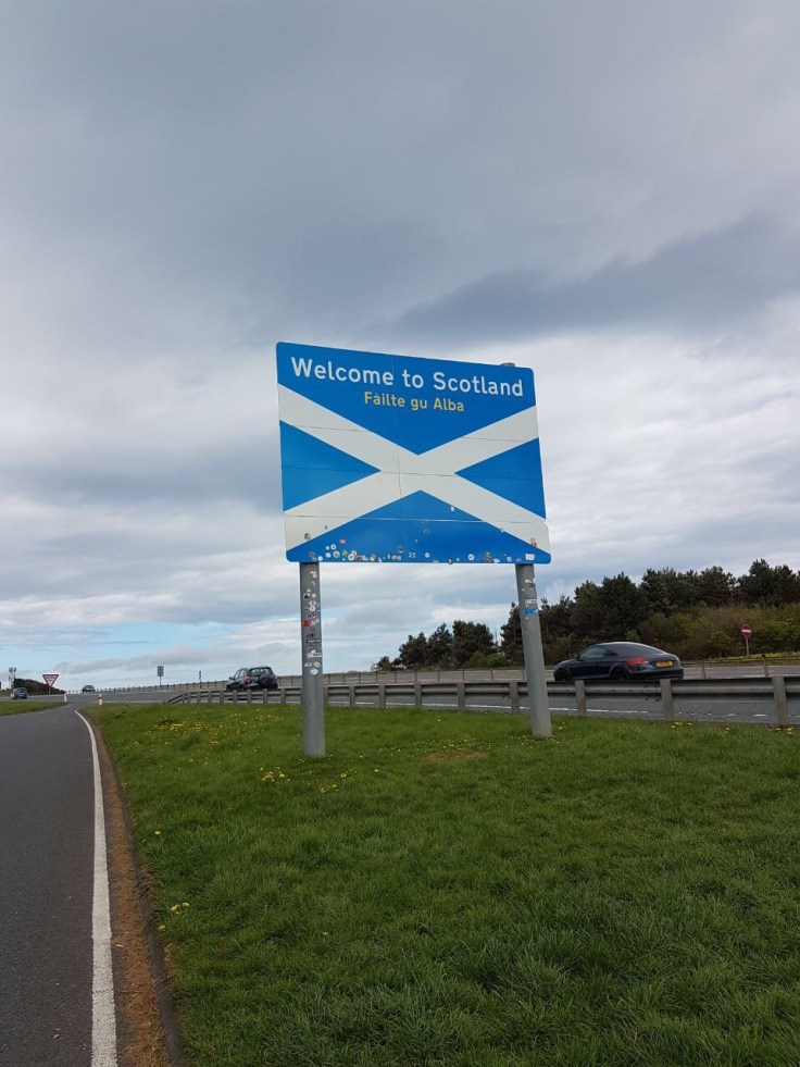 Als sich die Borstentiere beruhigt hatten und das obligatorische Bild an der Schottlandflagge gemacht wurde, ging’s weiter durch das wunderschöne Schottland entlang der malerischen Straßen nebst den von allerlei totem Gekräuch gesäumten Wegesrändern. (By the way, nach hiesiger Zählung 27x Fasan leblos, 2x Fasan lebhaft, sowie 2 halbe Stücken Rotwild).
