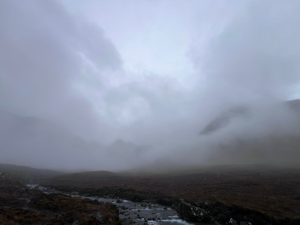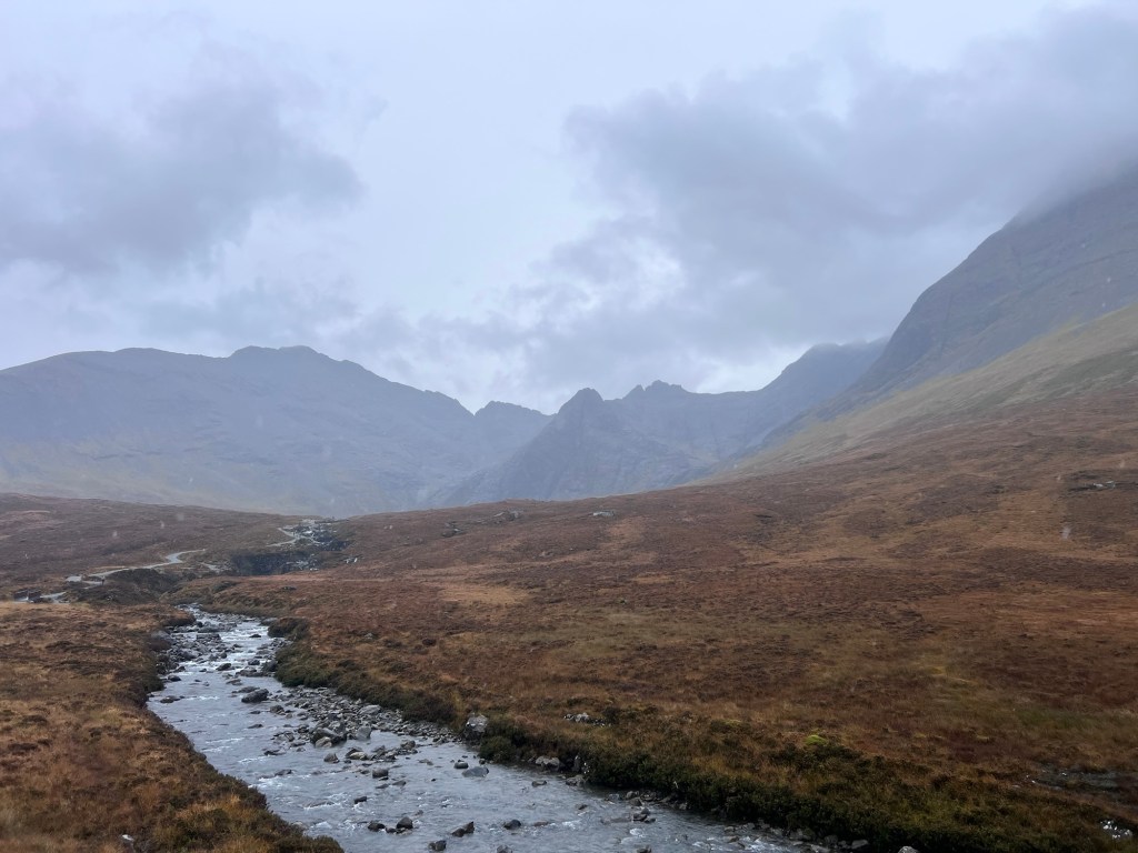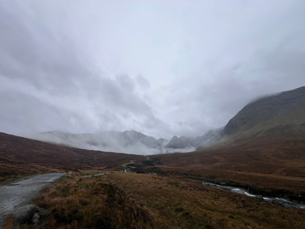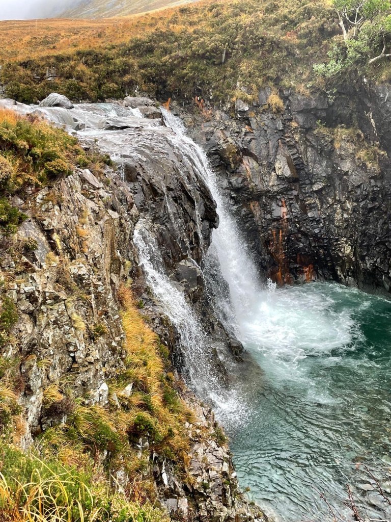 Indes Ihrö Heiligkeit, die Chefin, blieb augenscheinlich schwerst erkrankt im Red House in Dornie zurück. Bei – dort – „herrlichstem Sonnenschein“, „inklusive Regenbogen“, stand es wohl kurz auf des Messers Schneide (so die spätere Heiliginneneinlassung). Ihr Blick als wir davonfuhren war eine Mischung aus dreht Euch nicht um und lasst mich zurück – beinahe herzzerreißend… nun, wir brausten von hinnen in Richtung Fairy Pools und trauerten ihrer Abwesenheit noch lange nach.